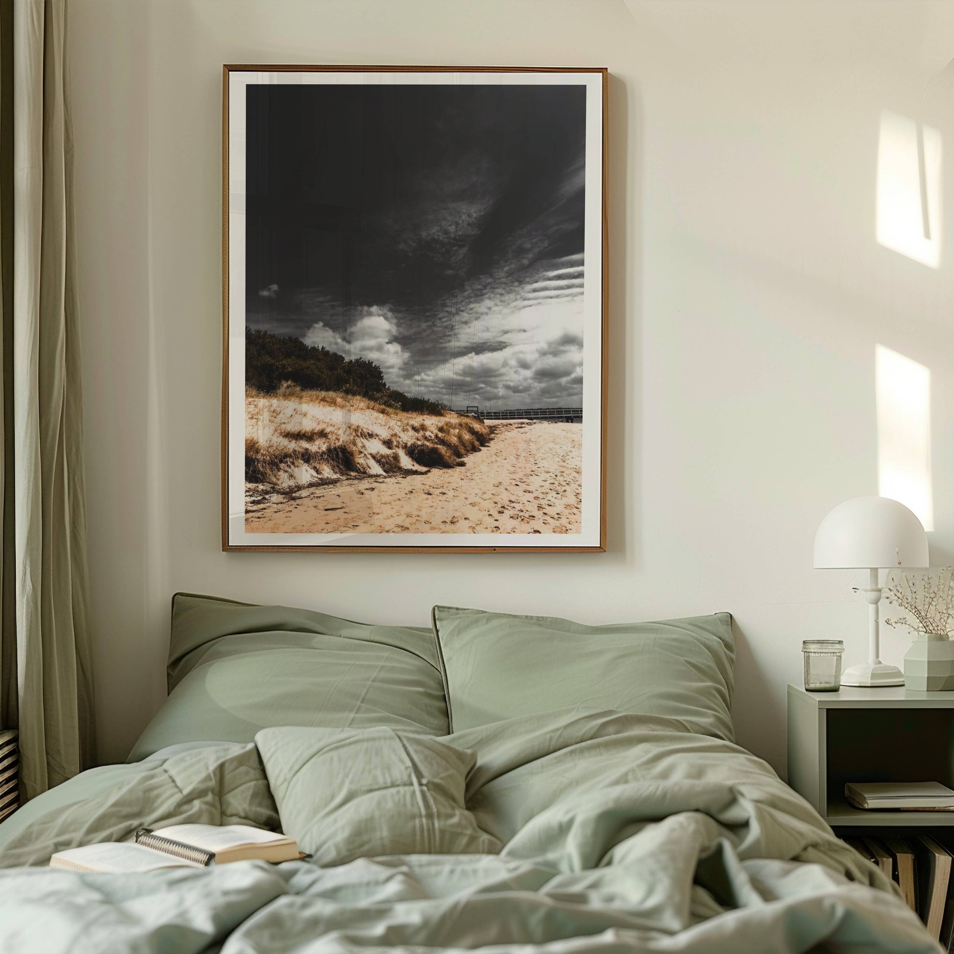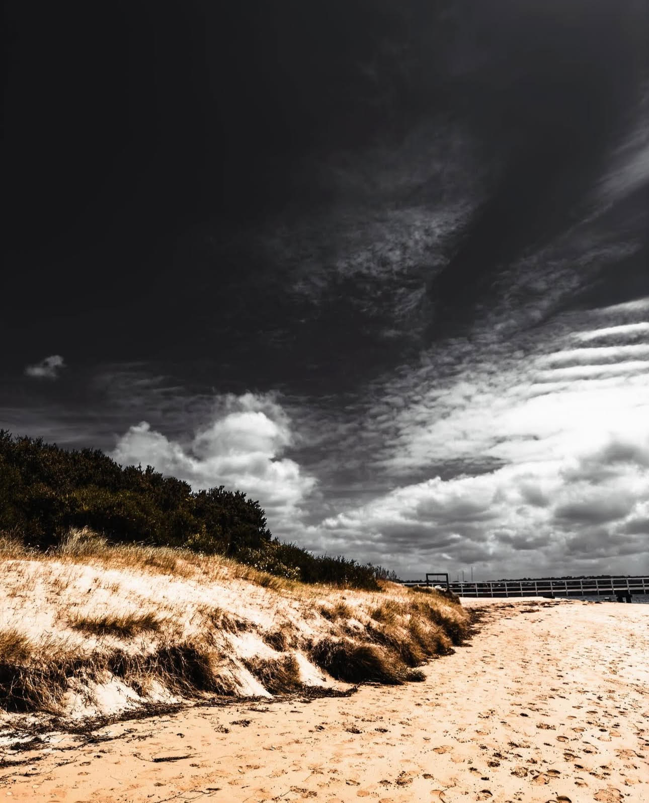 Dark clouds gather over the Barwon dunes, casting a dramatic contrast between the brooding sky and footprint laden sand below.