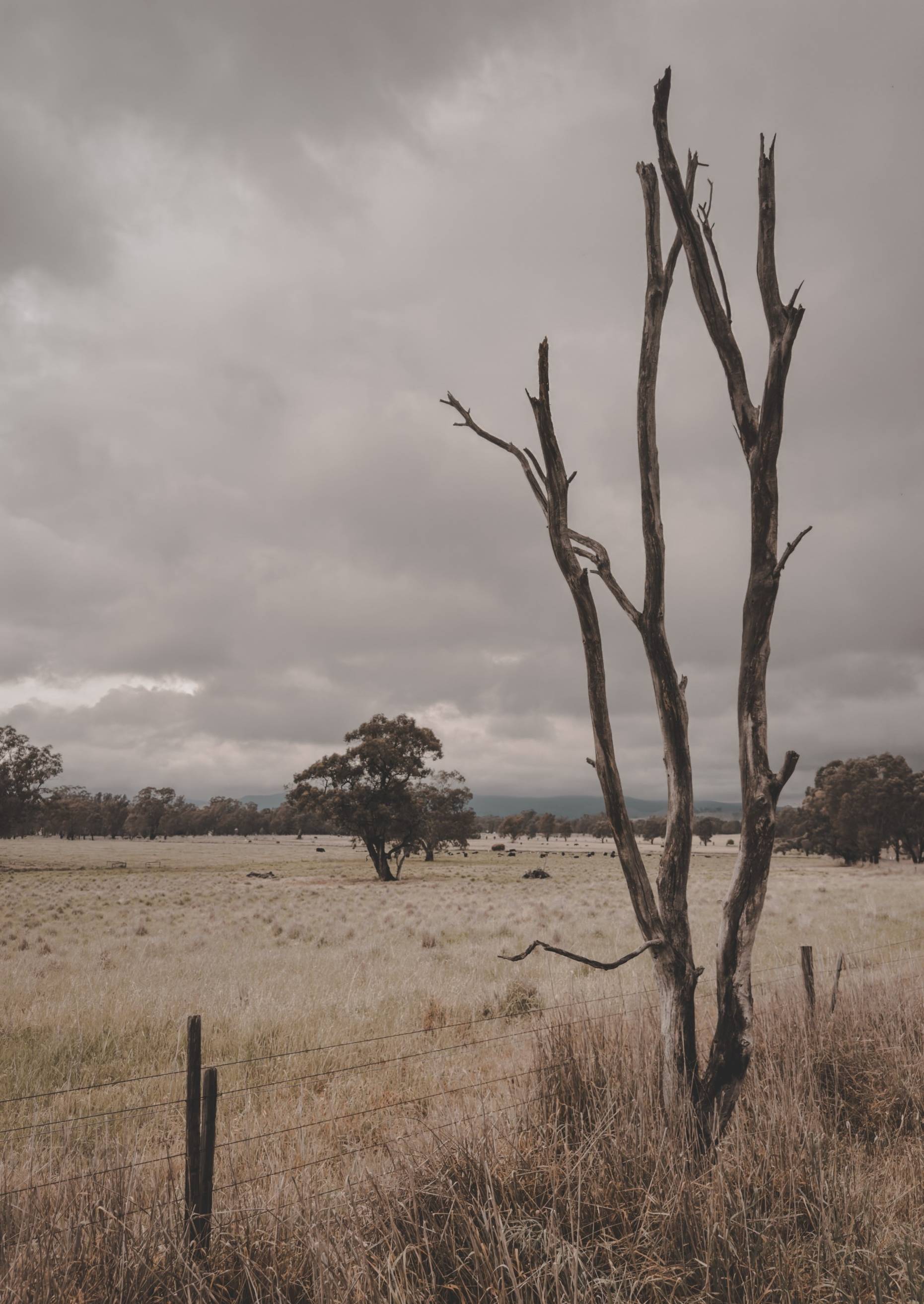 A brooding sky, where clouds meet the mountains and cows grazing in the distance against the silhouette of the gum tree evokes a sense of tranquility and the stillness of a moment halted by chance.