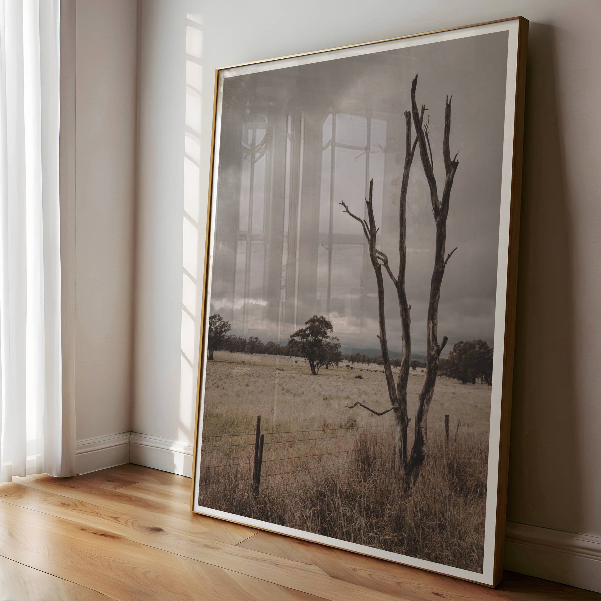 This print was captured rather serendipitously during a roadside pause on the way to Strathbogie. As the car lay waiting for a tow, the scene of a dead gum tree, its branches framing an expansive Australian vista, caught my cameras lens.