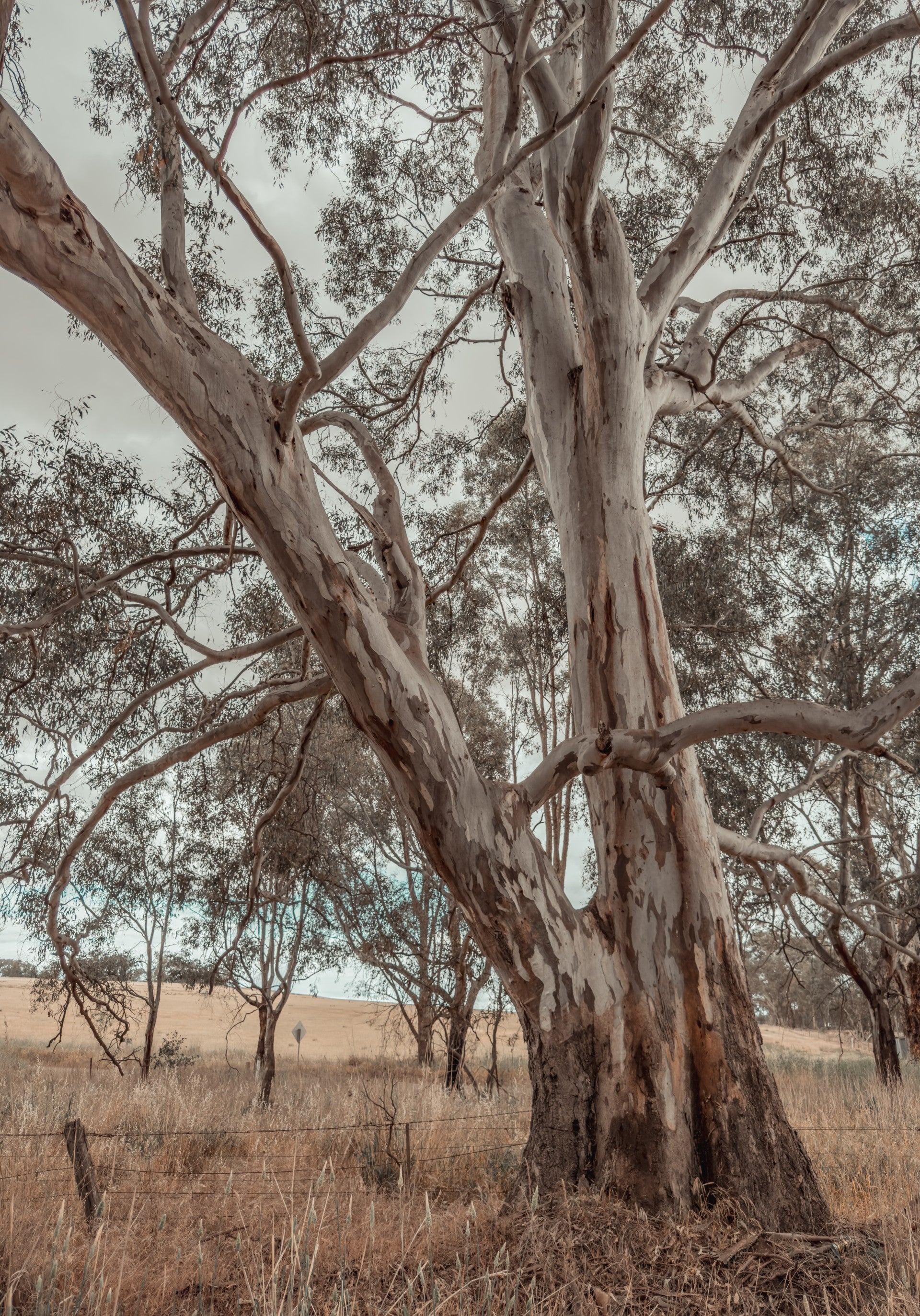 A large eucalyptus tree with a wide trunk and sprawling branches. A quintessential Aussie lane.
