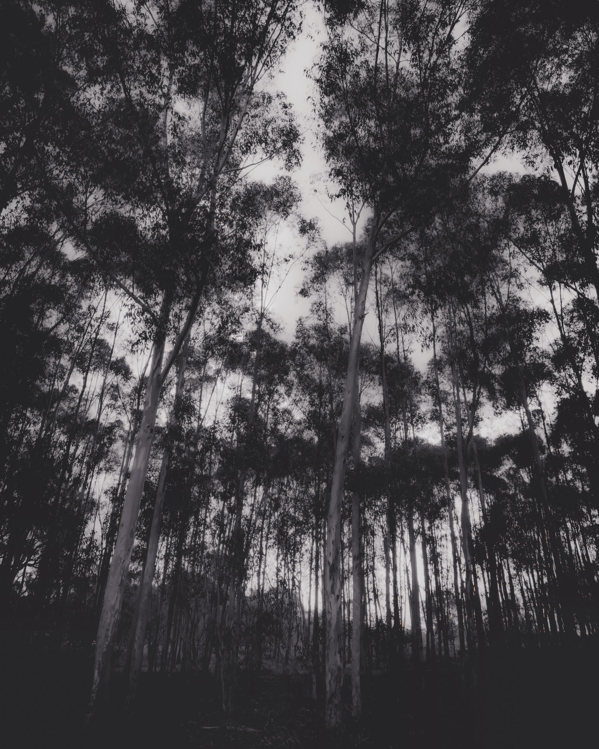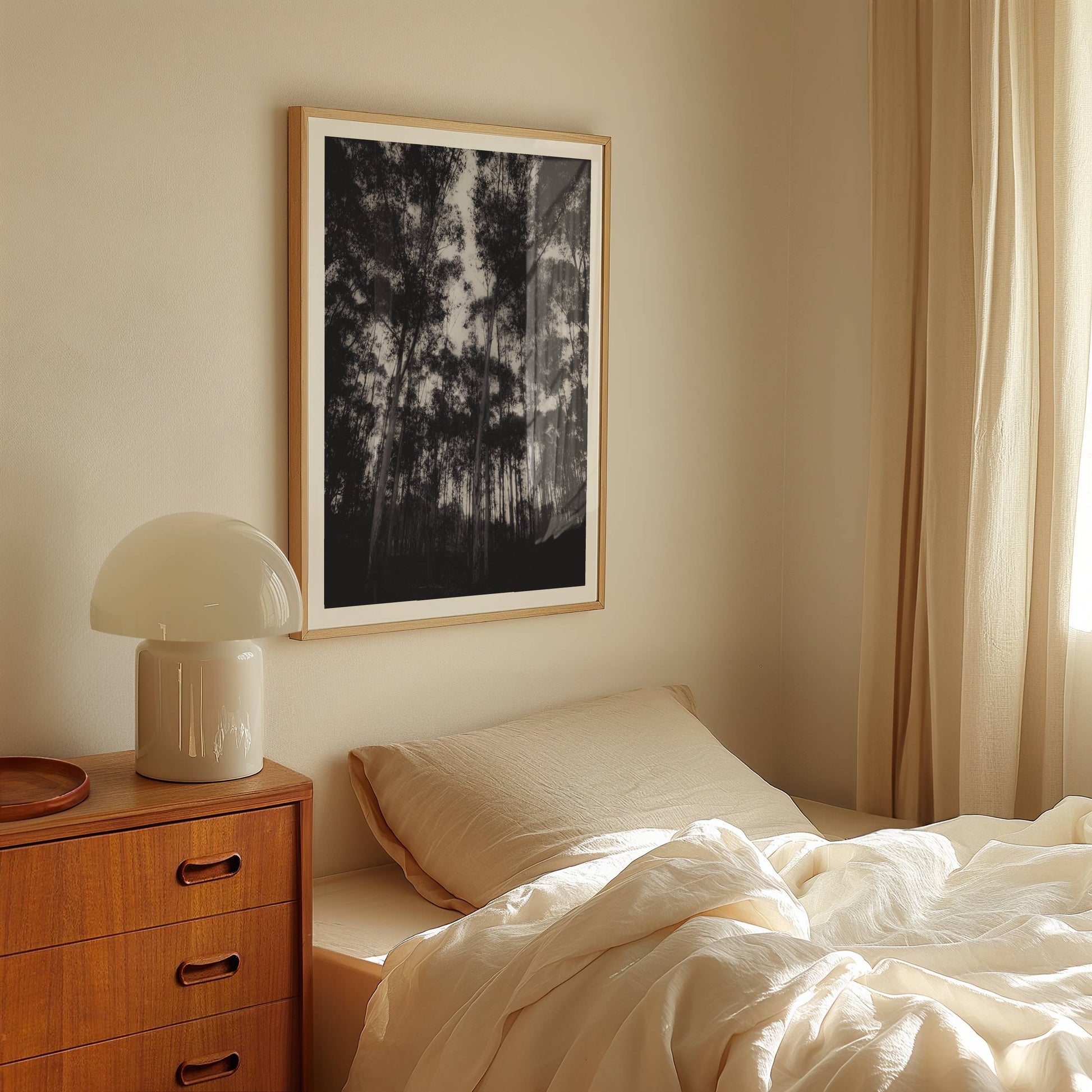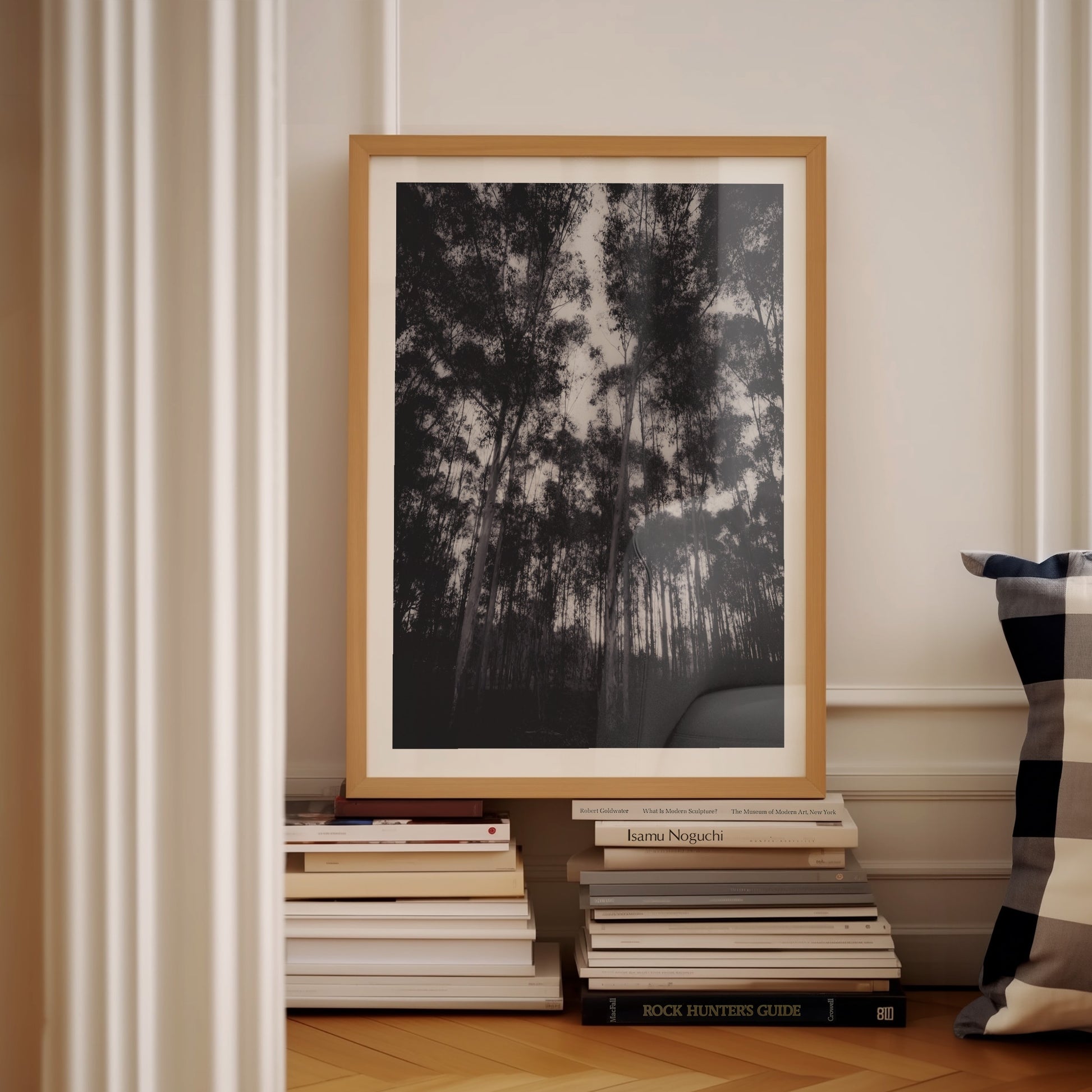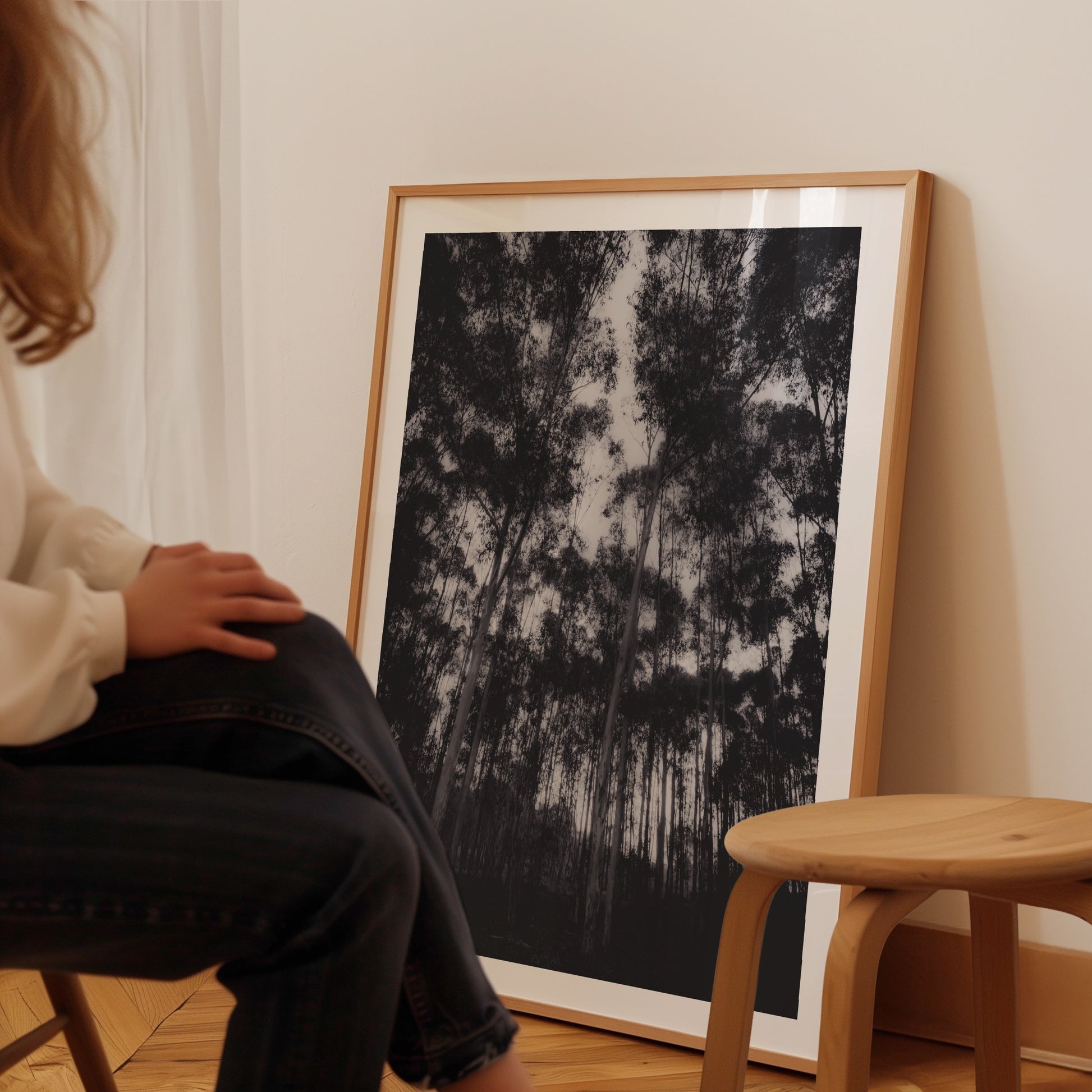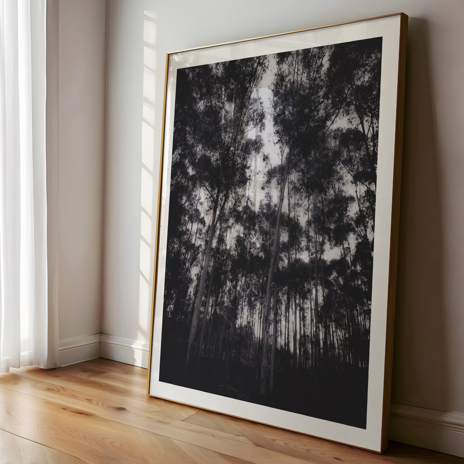 Our "Gum Tree Dreaming" print encapsulates the ethereal beauty of young eucalyptus trees reaching skyward, their slender forms hauntingly bathed in a deep, hazy light.