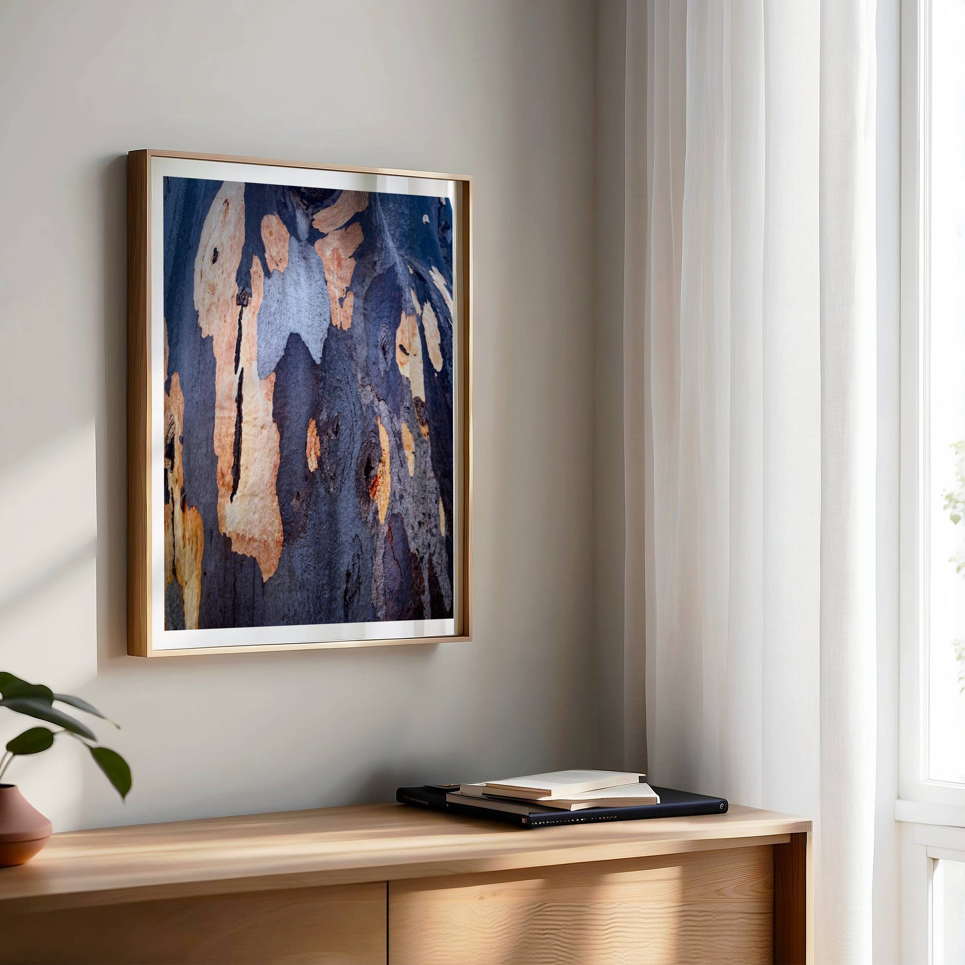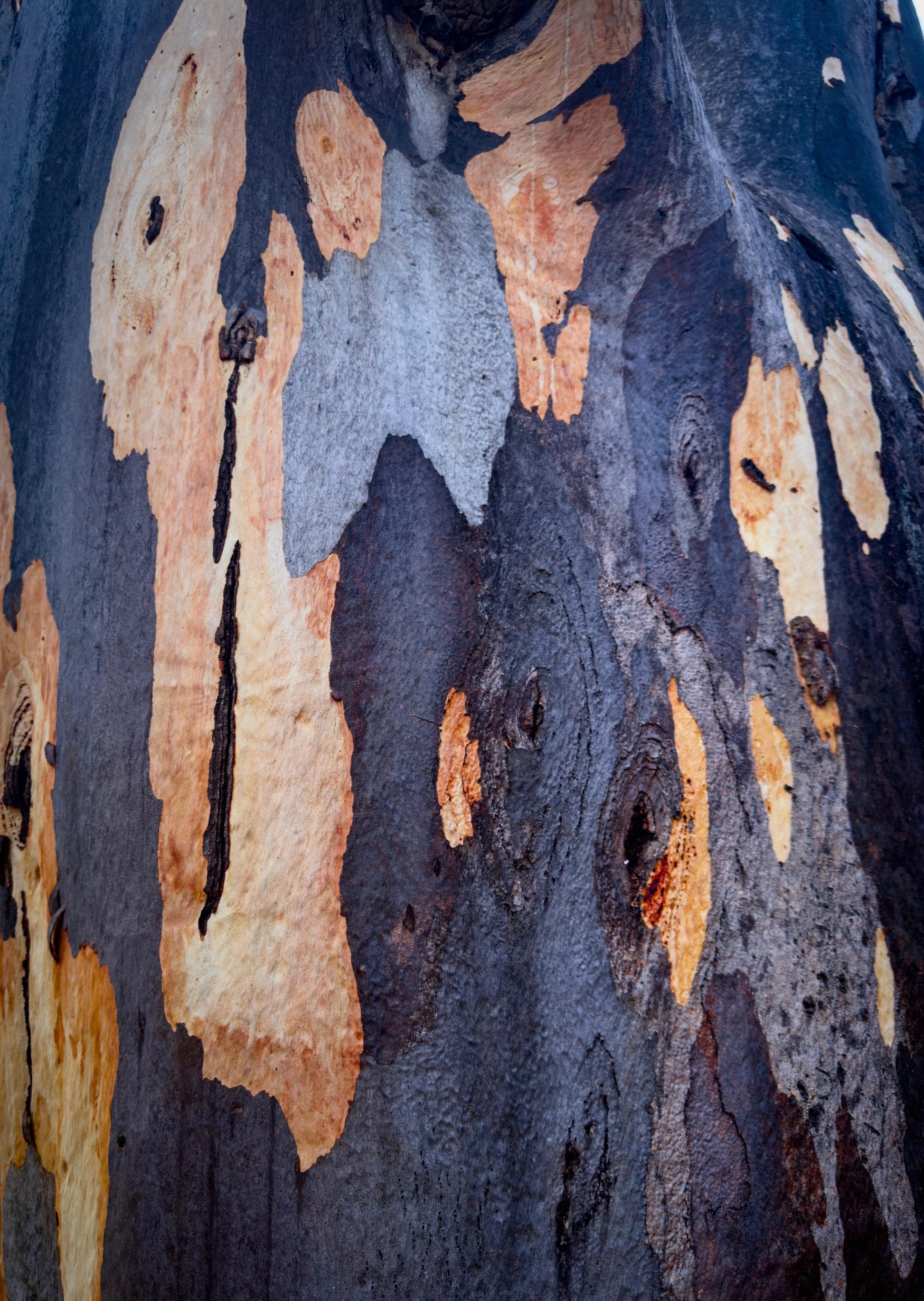 A stunning close up of weathered tree bark that transforms organic textures in natural abstraction. Earthy hues of charcoal, slate gray and sun kissed amber intertwine, creating fluid, painterly patterns that evoke a sense of movement and renewal.