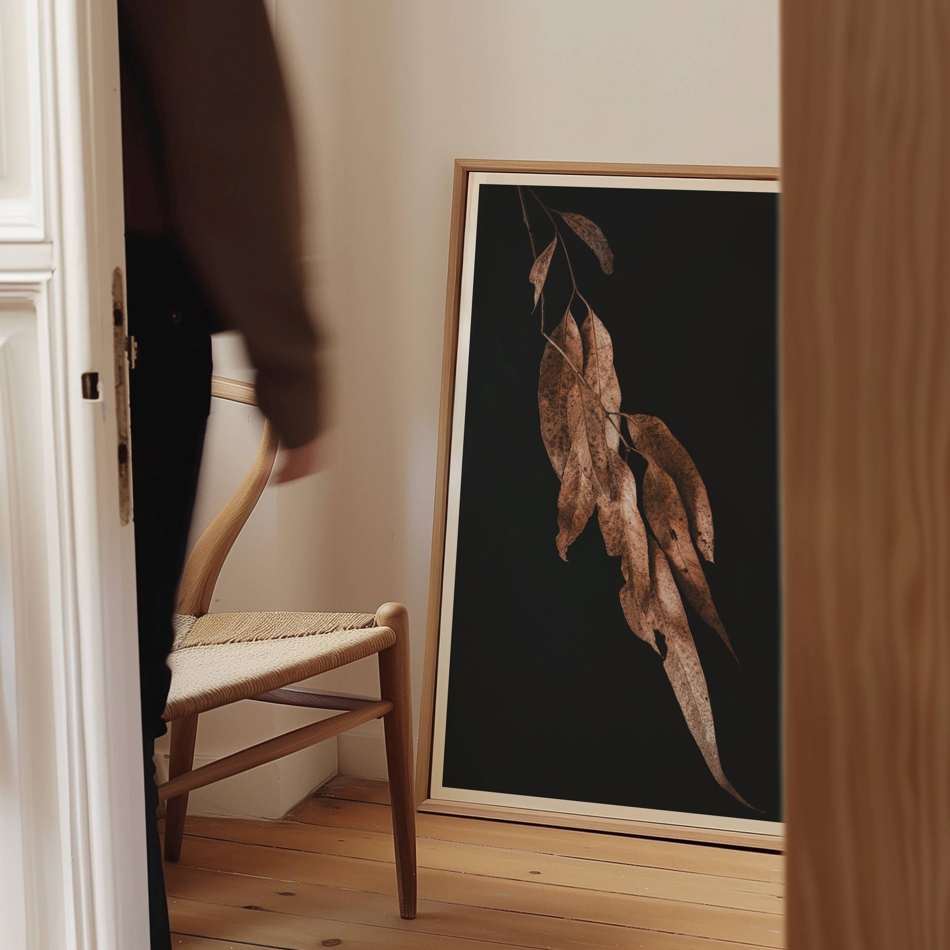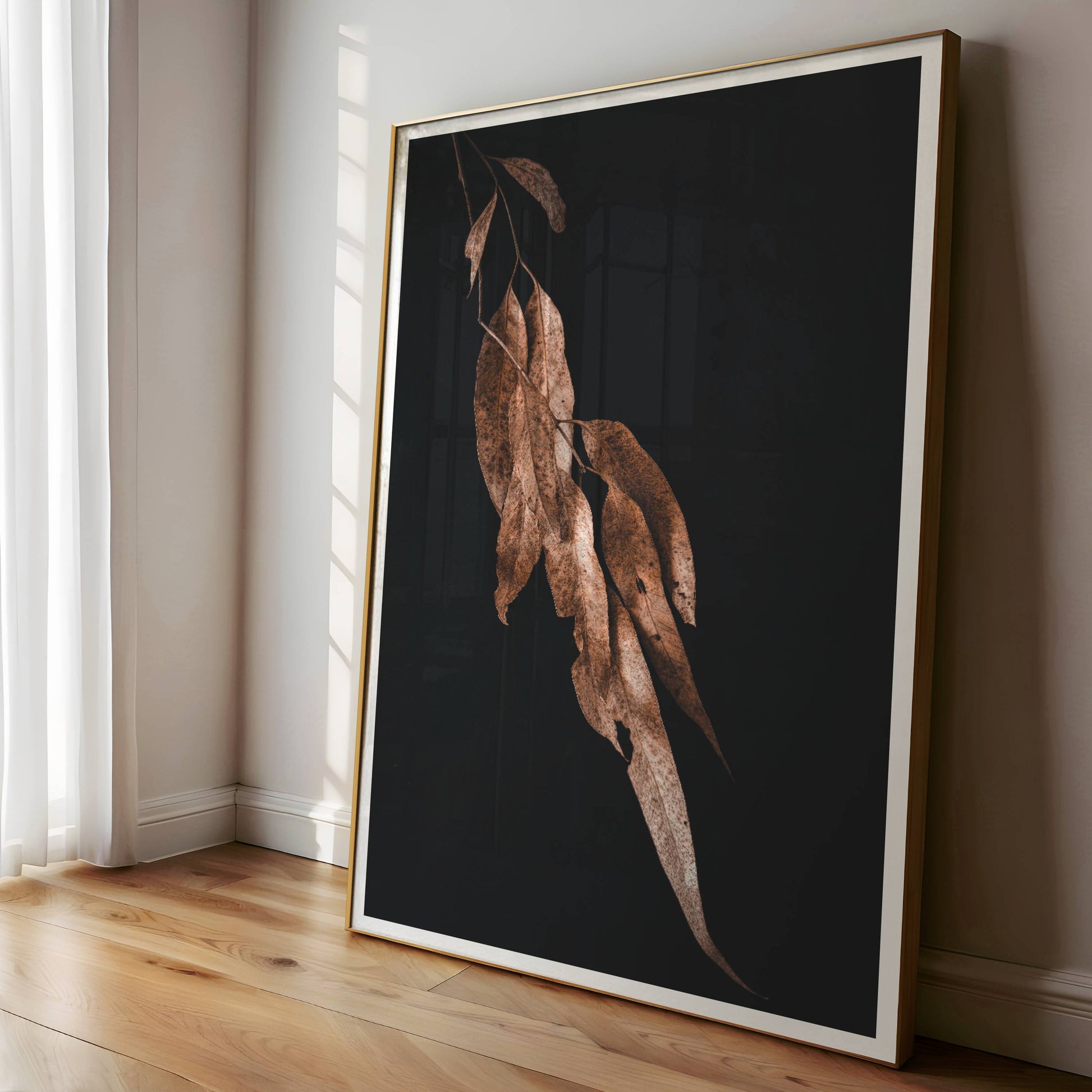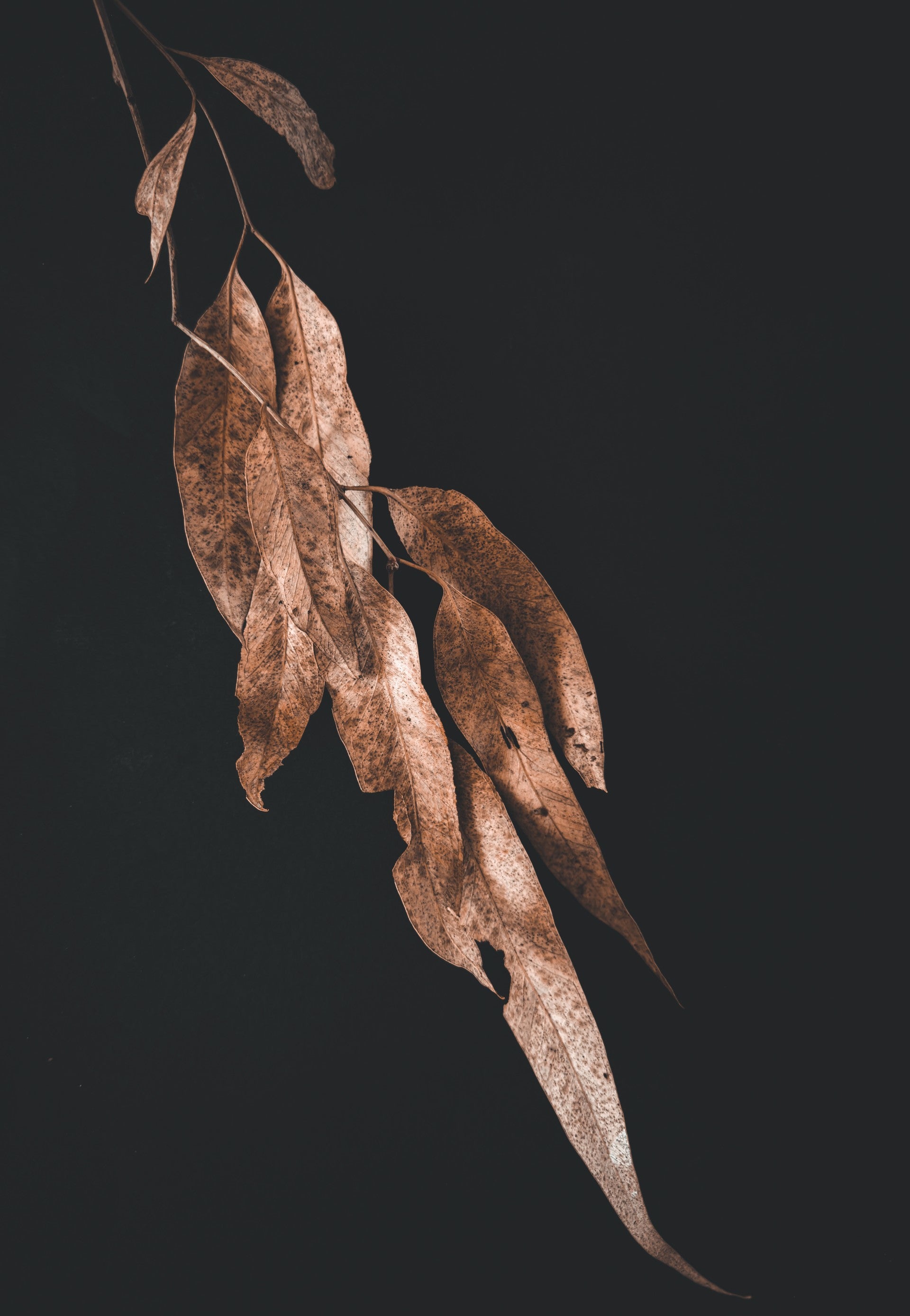 Senescence captures the delicate beauty and movement of decaying eucalyptus leaves. Set against a strikingly moody backdrop, the leaves seem to float effortlessly.