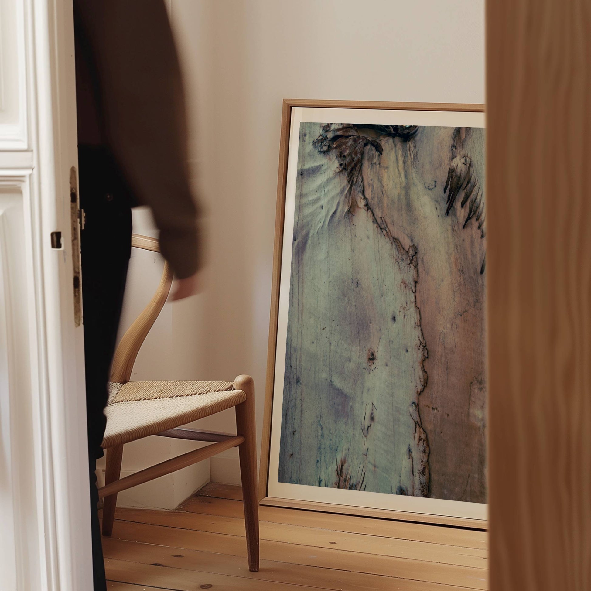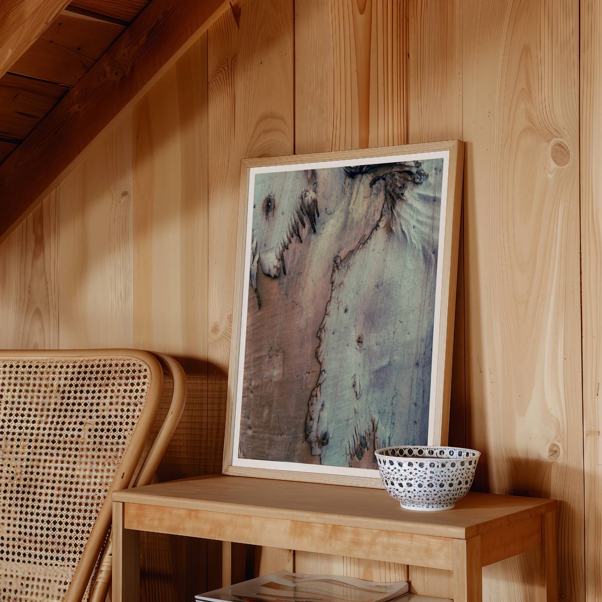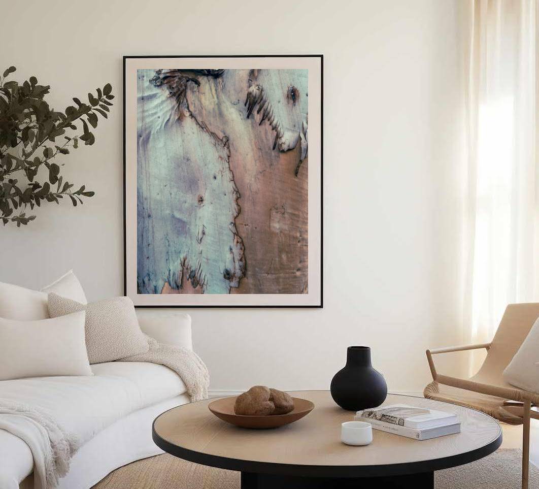 This wall art print captures the wondrous texture of an eucalyptus tree shedding its back, revealing layers of muted tones and organic lines. The natural fringe detail, reminiscent of a horse's mane, adds a dynamic, sculptural quality to the composition.