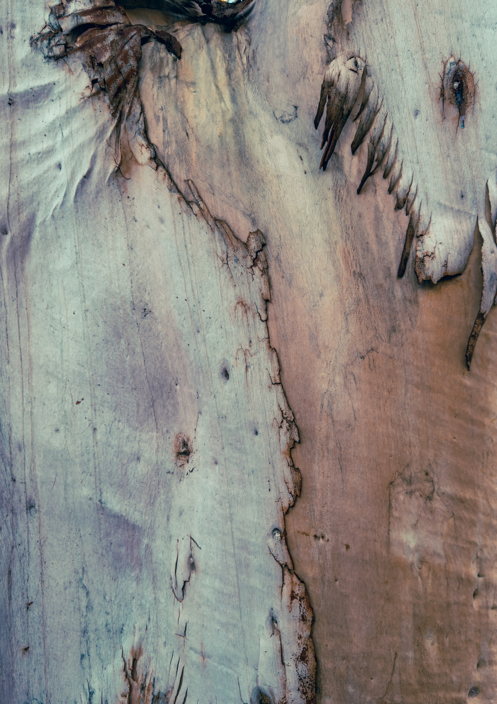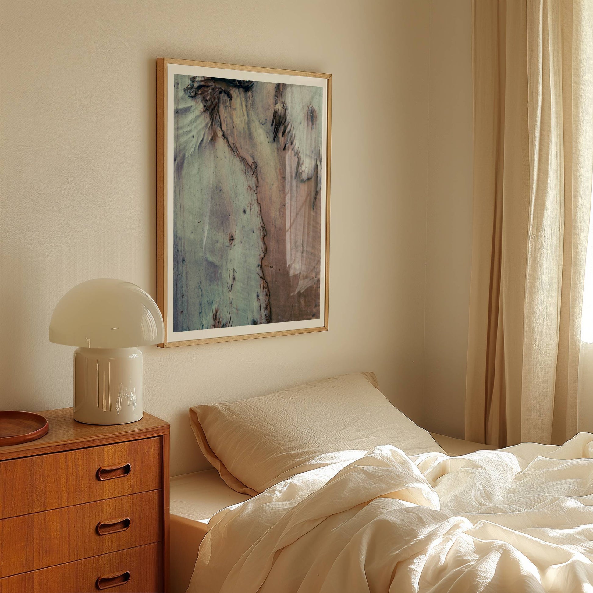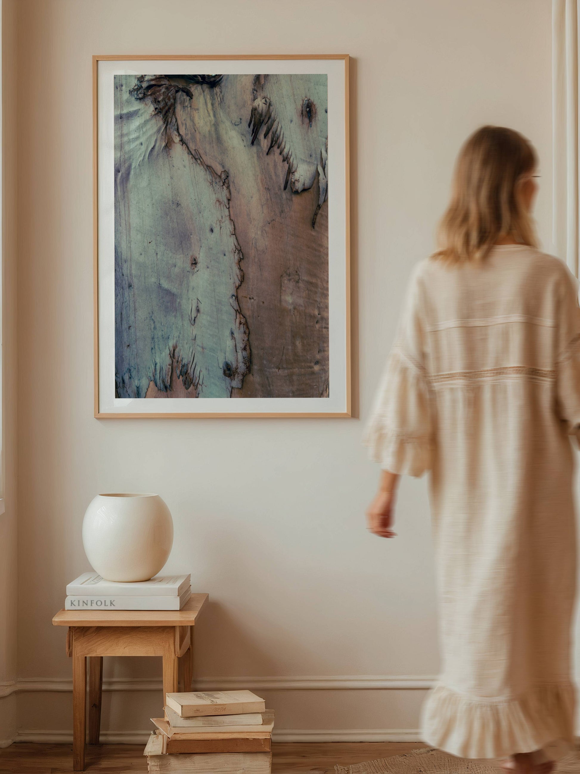 This wall art print captures the wondrous texture of an eucalyptus tree shedding its back, revealing layers of muted tones and organic lines. The natural fringe detail, reminiscent of a horse's mane, adds a dynamic, sculptural quality to the composition.