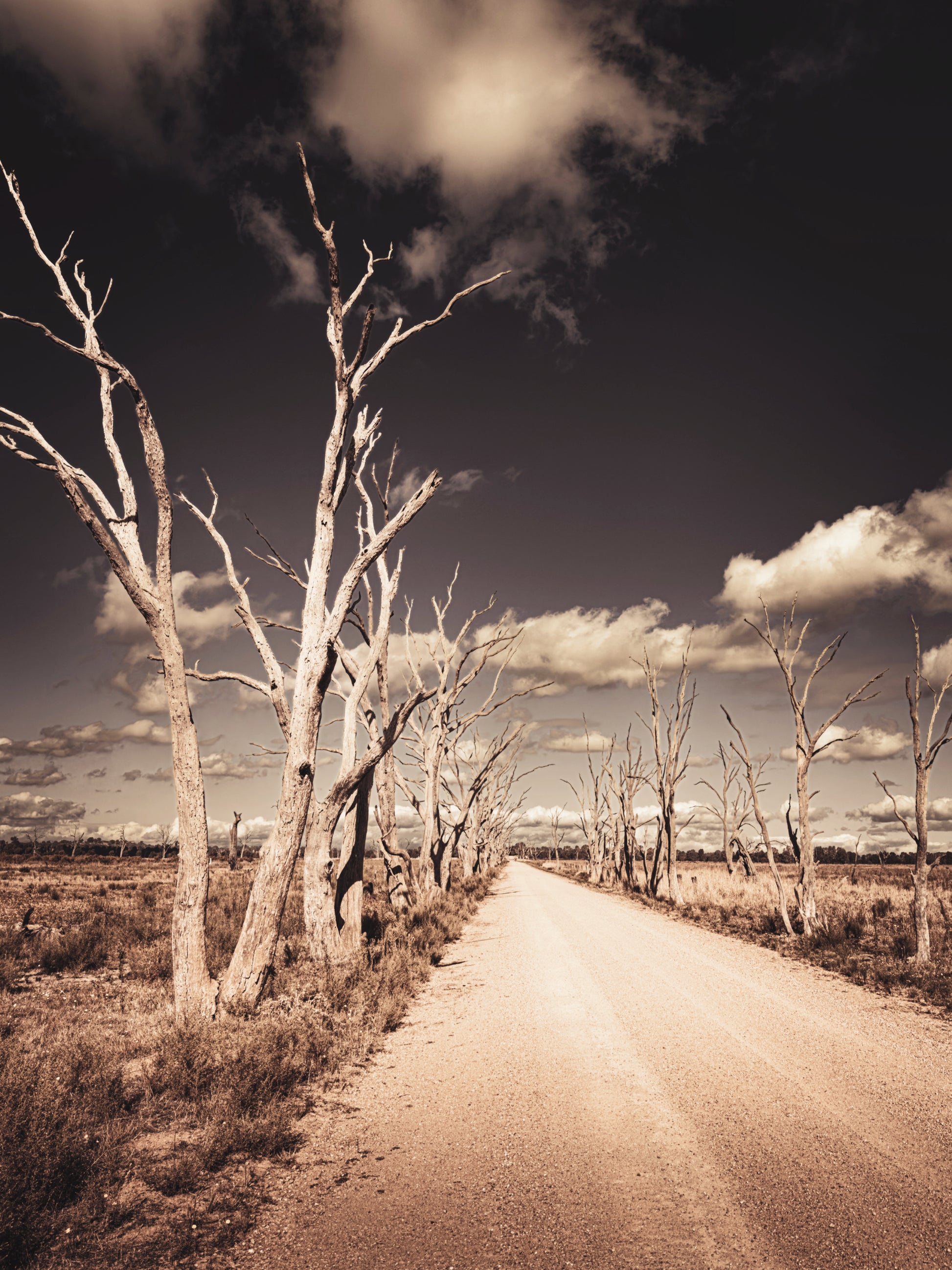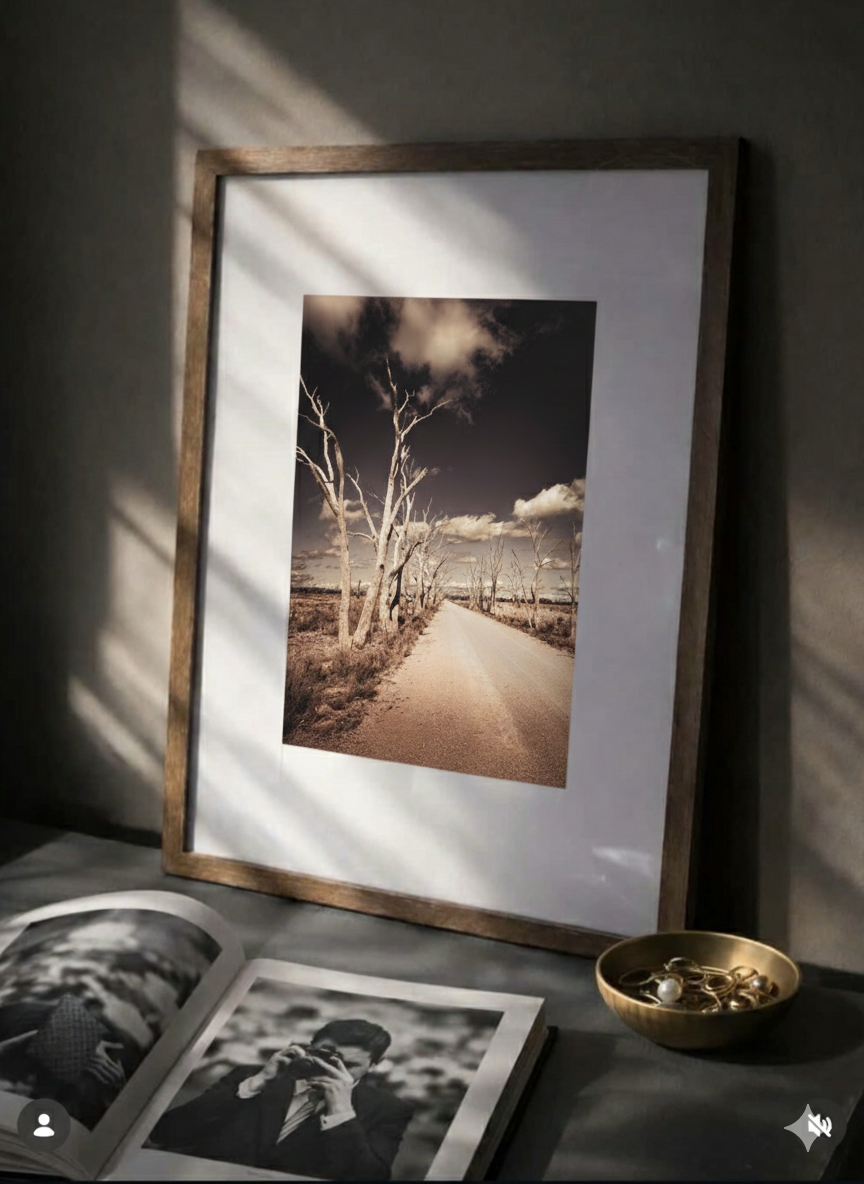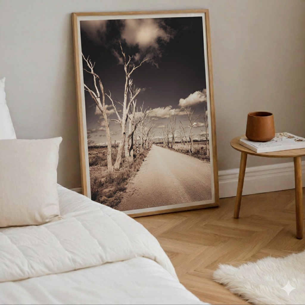 The soft contrast between the pale earth, ghostly trunks and brooding sky creates a sense of stillness and reflection, drawing the eye gently down the road and into the horizon. There is subtle tension here: beauty and desolation existing side by side, telling a story of endurance and place.
