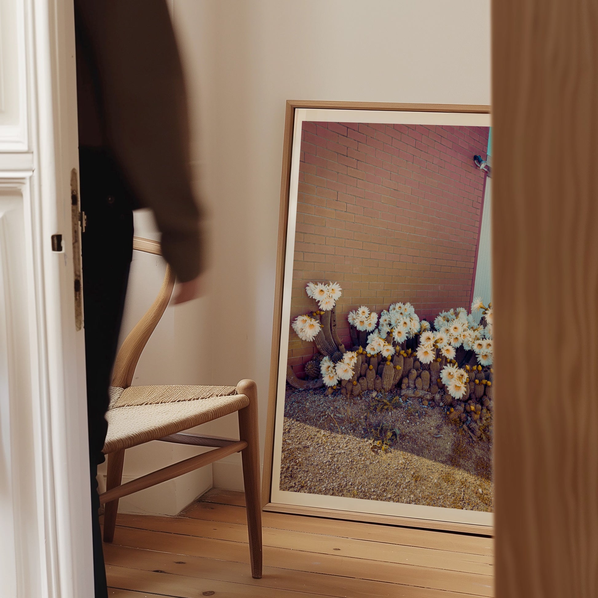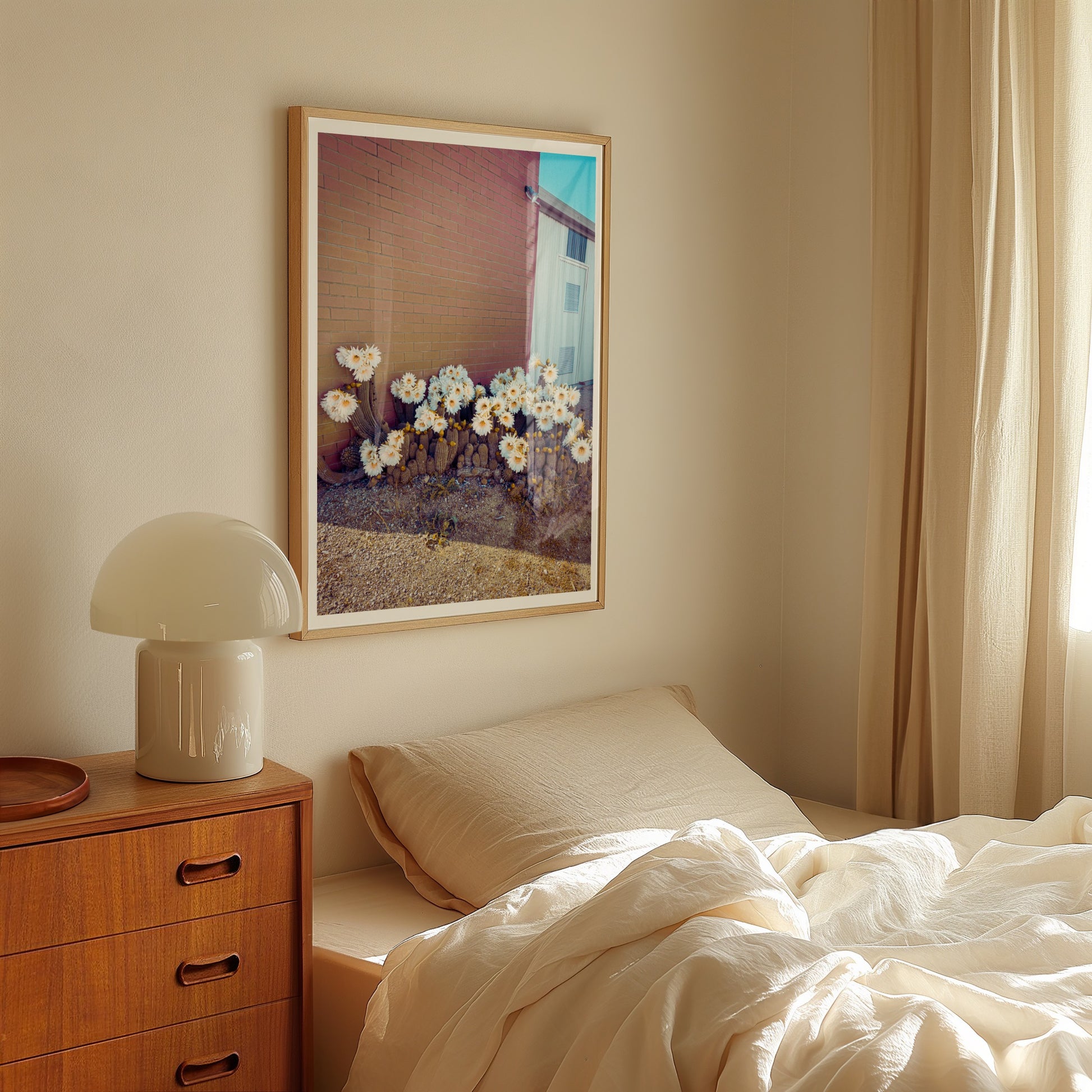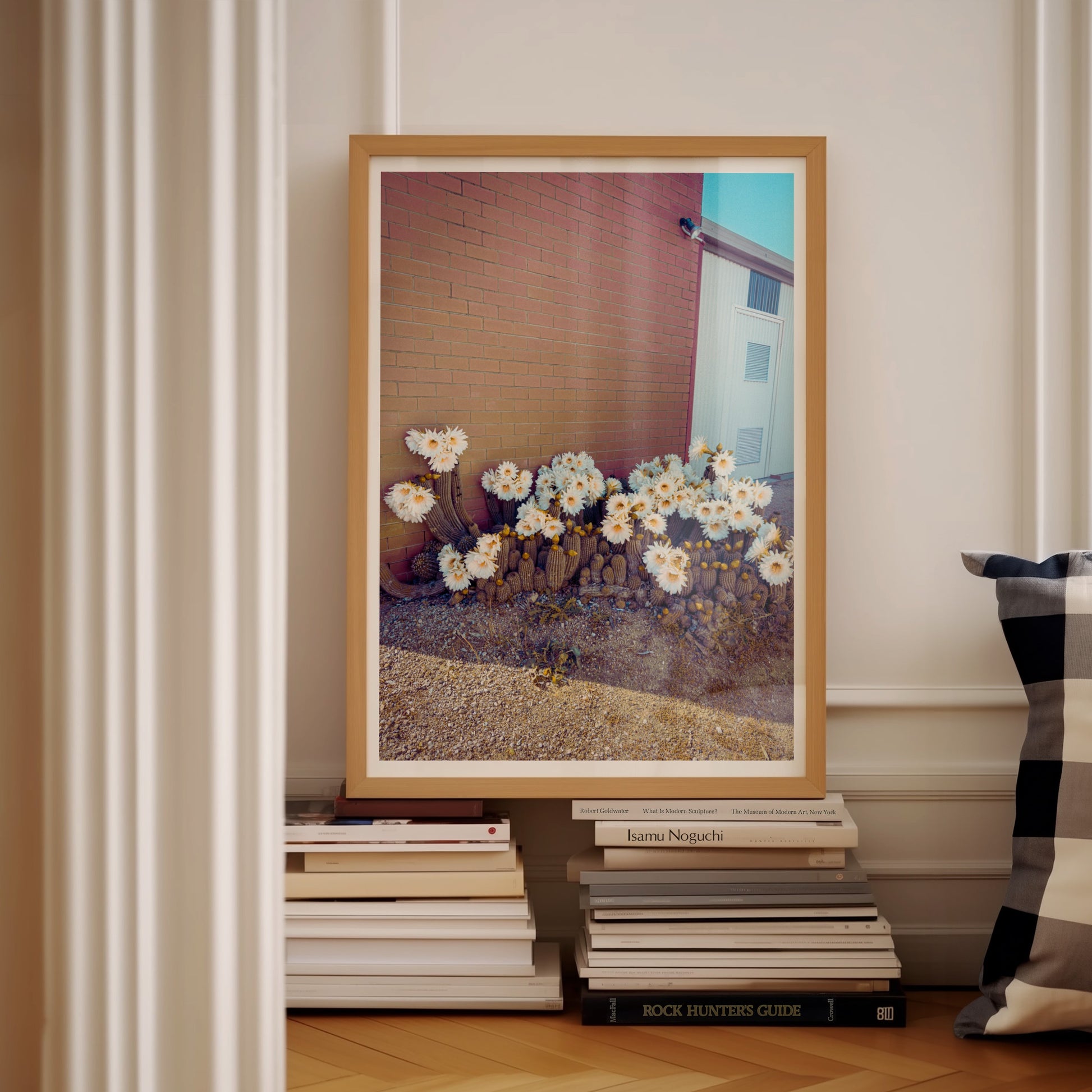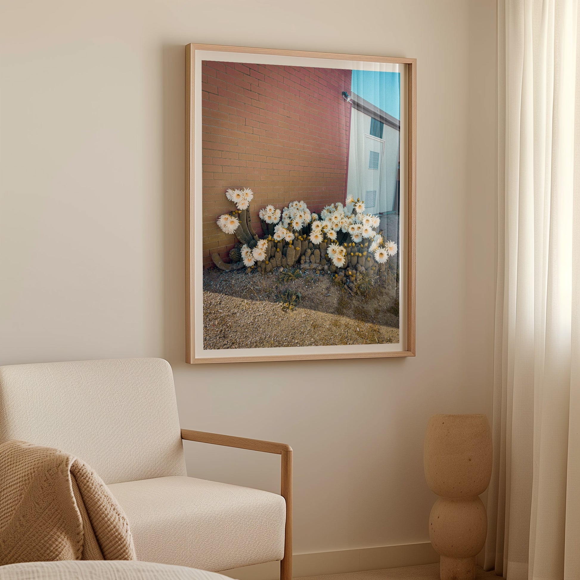 A cluster of cacti adorned with radiant white blooms, thriving against the backdrop of an unyielding brick wall. Warm and earthy tones and ethereal blossoms make a modern and fun print.