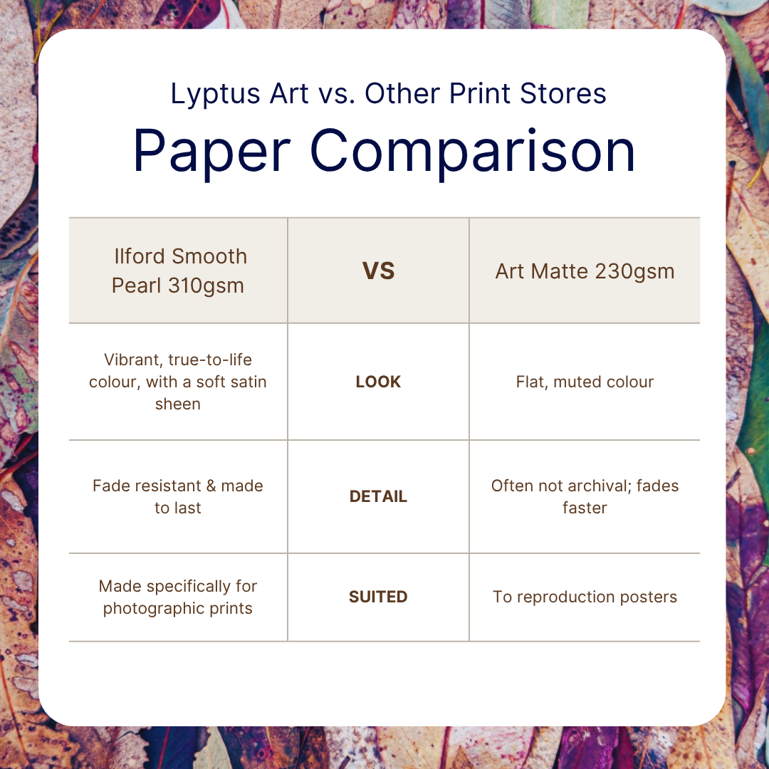 Printed on Ilford Smooth Pearl 310gsm paper. A premium gallery grade paper that brings each detail to life. Unlike thinner, flat matte prints that many studios use to cut costs, this finish offers richer tones, sharper contrast, and a subtle sheen that elevates the artwork.